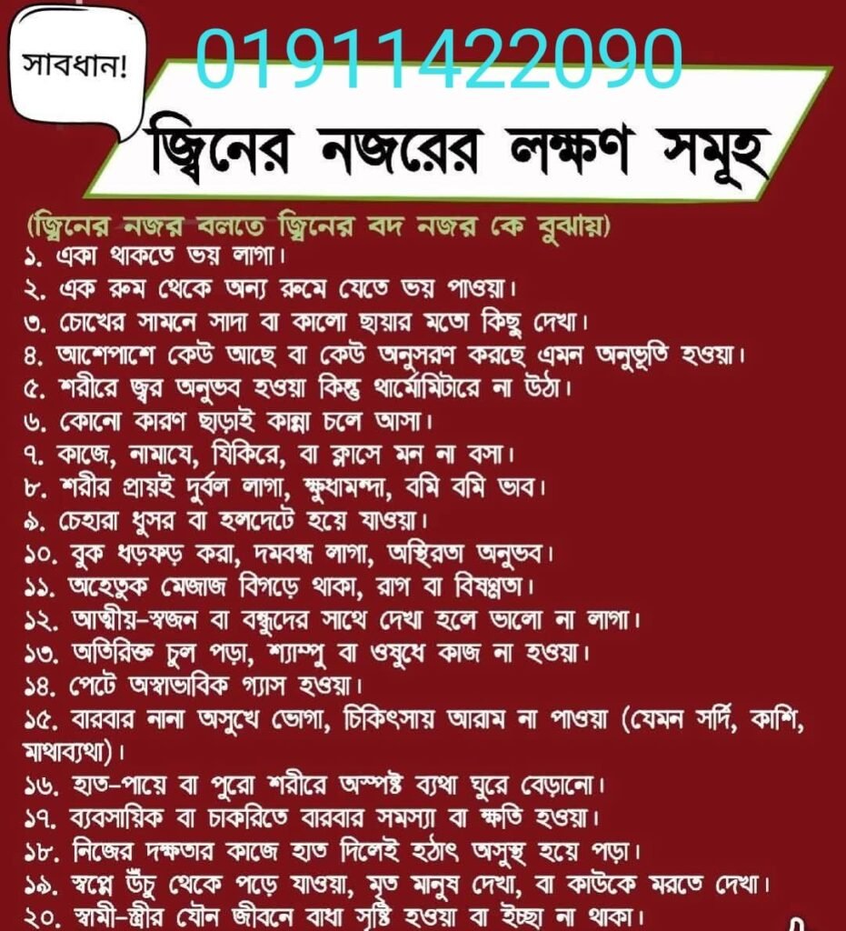 - ঘুমের মধ্যে ভয় পাওয়া, চাপা ঘুম - হঠাৎ অকারণে মাথাব্যথা বা শরীর ভার লাগা - চিকিৎসা করে ভালো না হওয়া - দুশ্চিন্তা, অস্থিরতা, হঠাৎ রাগ বা কান্না - ঘরে অশান্তি, কাজকর্মে বাধা - সন্দেহ হচ্ছে জ্বিন, বদনজর বা কালো জাদুর প্রভাব?